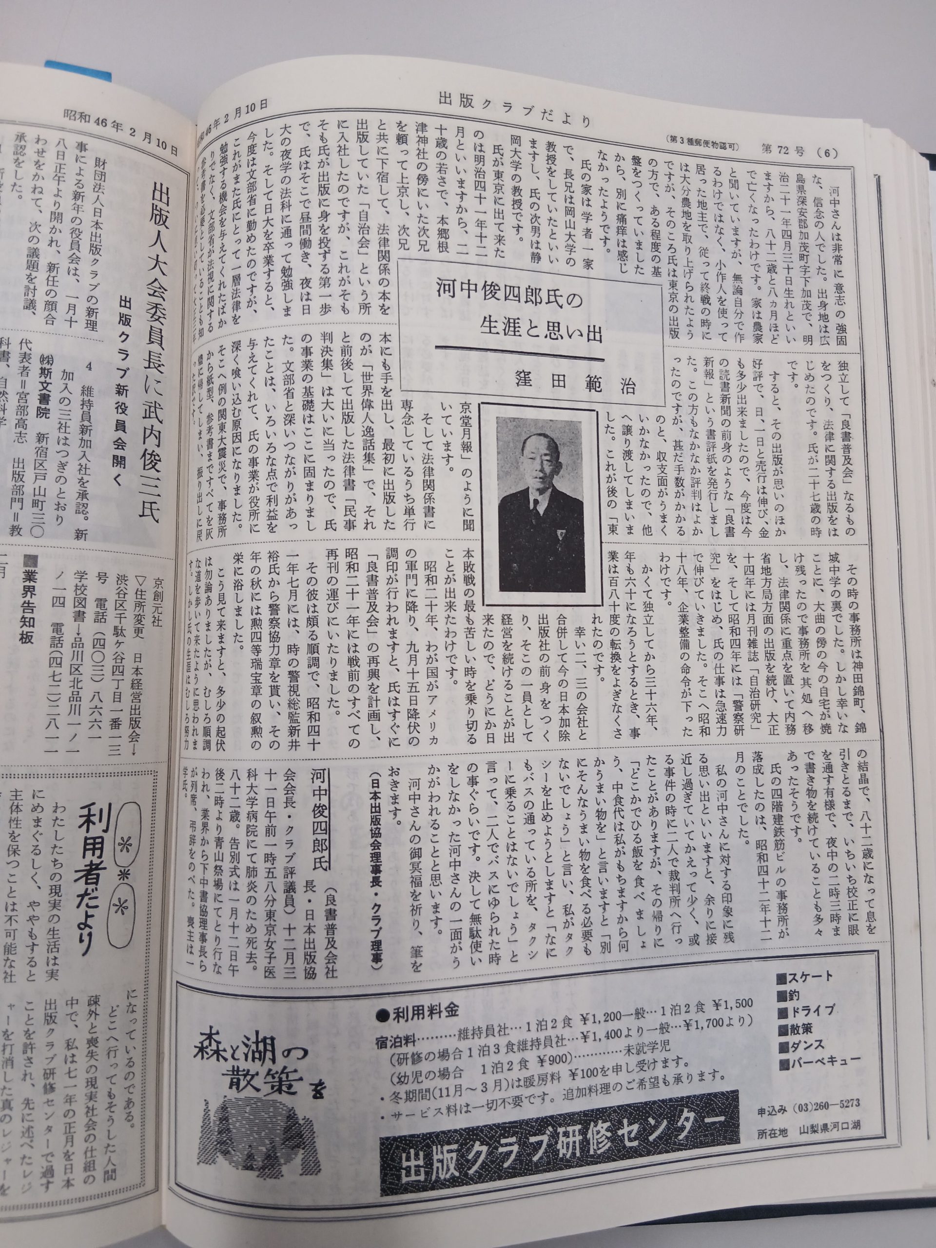 【図4】『出版クラブだより』1971年2月10日号掲載の良書普及会創業者・河中俊四郎への追悼文